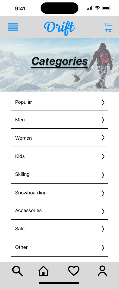 Drift is a company with an ecommerce app that sells winter gear and clothing. I wanted to keep the colors light to reflect the feeling of winter with all the snow. Blue was added as an accent color to help add a pop of color. I kept a similar design to traditional apps for clothing and gear, so the user would recognize the layout of the app and navigation would be easier.